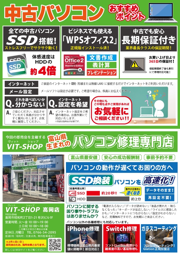 ※2/1(土)は、中古パソコン展示即売会の開催の為、高岡店は臨時休業とさせていただきます。